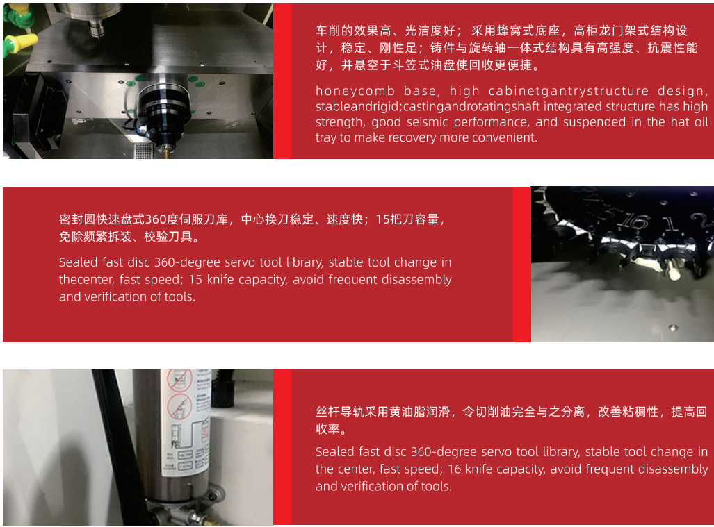 集 五 軸 立 體 空 間 雕 刻 帶 車 削 于 一 體 ; 車 削 的 效 果 高 、 光 潔 度 好 ; 省 時 省 工 ; 滿 足 各 種 弧 度 擺 動 類 產(chǎn) 品 需 求 。