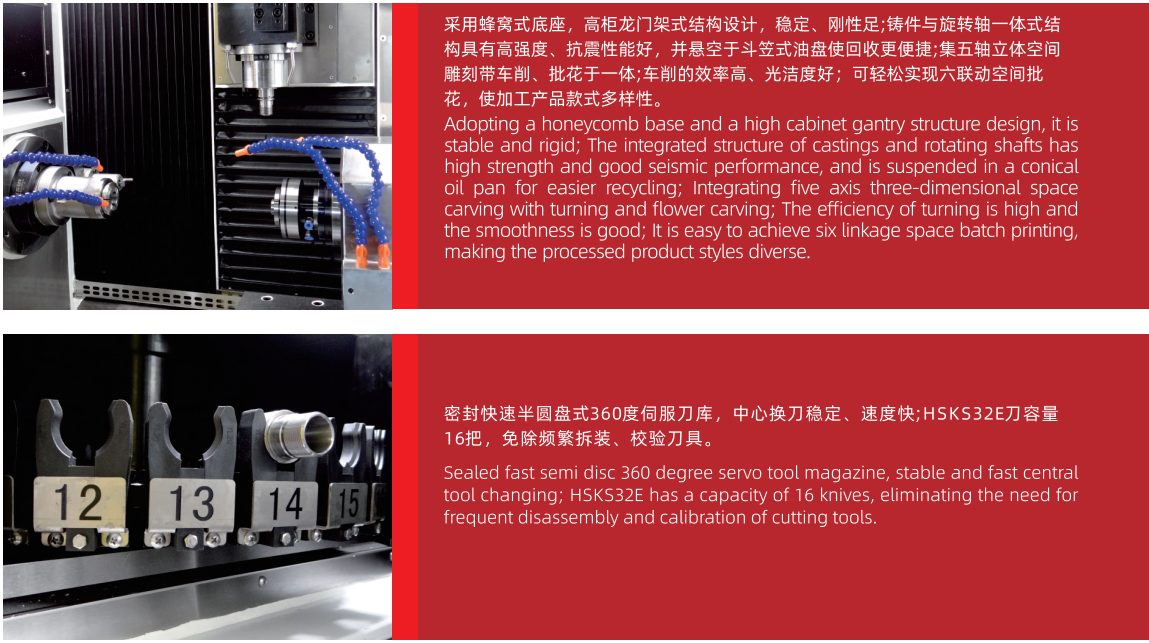 除具備數(shù)控五軸機床外的功能可輕松實現(xiàn)六聯(lián)動,替代傳統(tǒng) 工藝上難加工的螺旋紋、米字花、太陽紋等多樣款式;集五軸 立體空間雕刻帶車削于一體;車削的效果高、光潔度好;還可 快速完成平面銑削、鉆孔、攻絲、直槽、螺旋槽及銑齒等, 具有車削、銑削以及鏜削等復(fù)合功能,能夠?qū)崿F(xiàn)一次裝夾、 全部完工的加工理念。滿足大批量生產(chǎn);操作簡單方便,滿足 各種弧度擺動類產(chǎn)品需求。